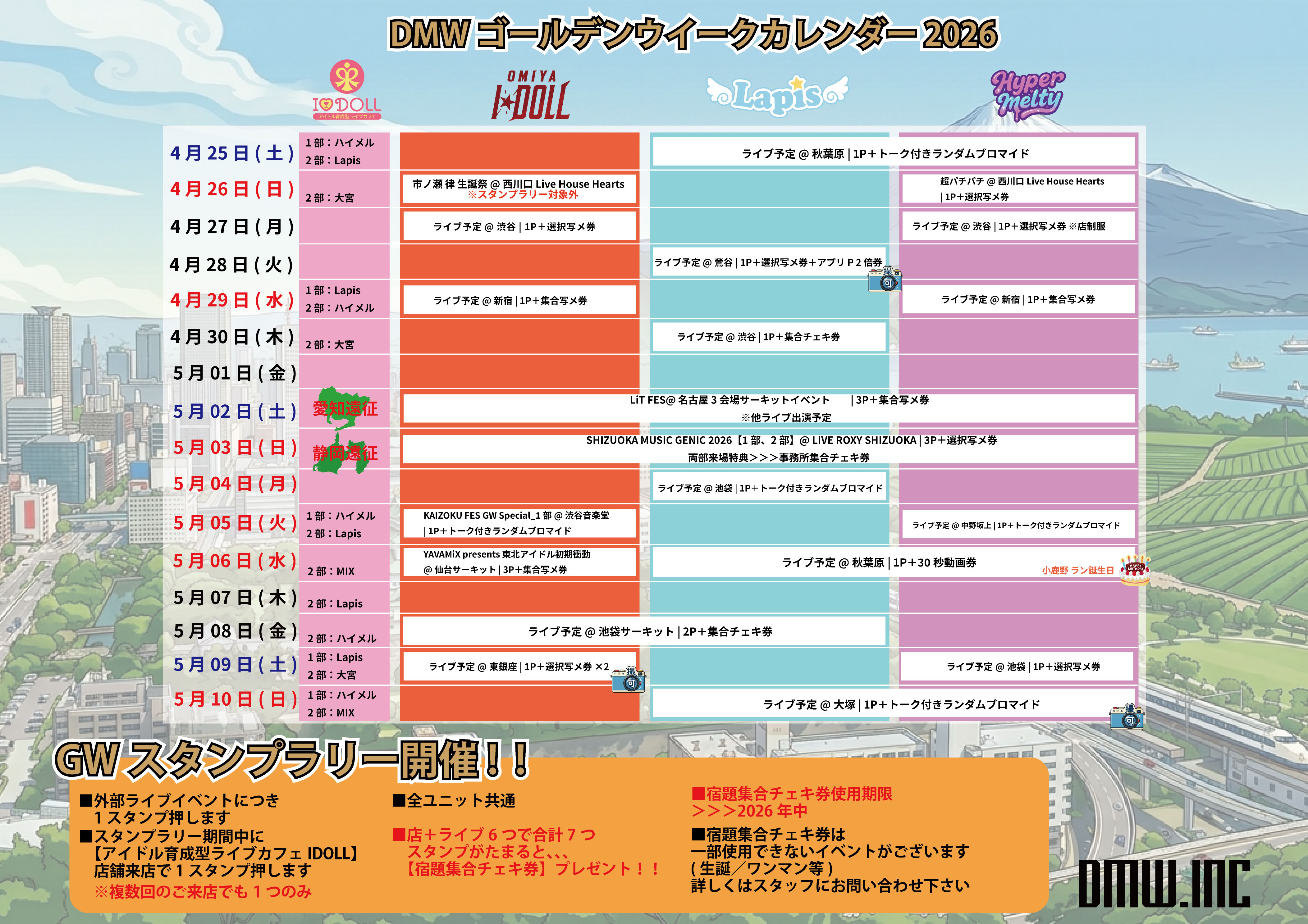 ゴールデンウイークもライブ盛りだくさんとなっておりますので、ぜひ弊社ユニットが出演致しますライブ及び【アイドル育成型ライブカフェ IDOLL】にたくさん遊びに来て頂けますと幸いです。皆様のご来場お待ちしております!